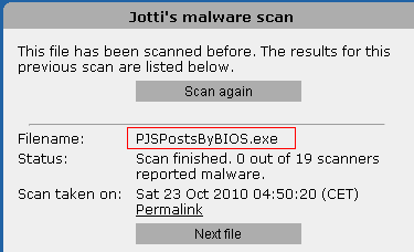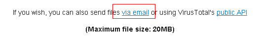 这个网站还支持通过电子邮件发送文件来扫描。可以将文件发到邮箱:scan@virustotal.com,邮件主题写:SCAN,稍等一会儿就会收到检测报告。